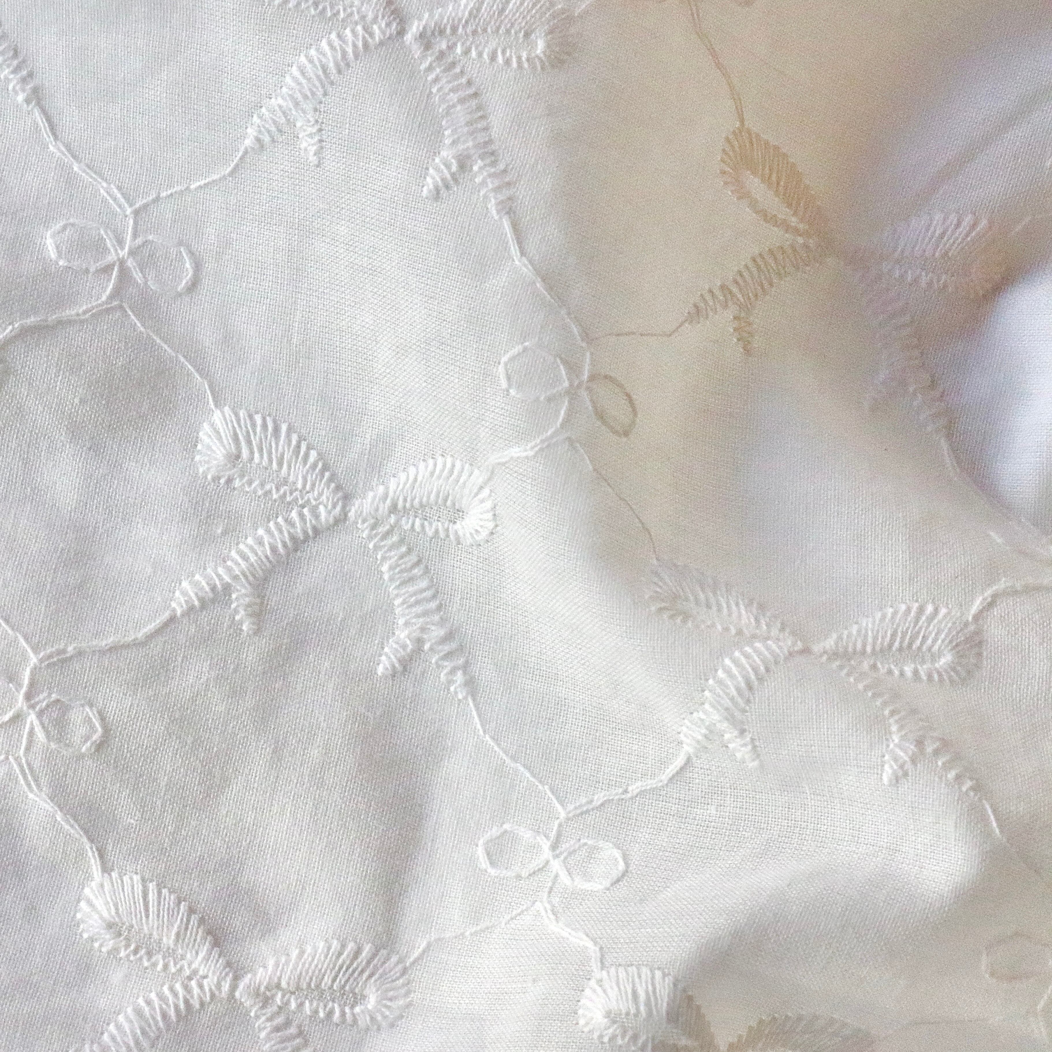薄手の綿ローンに可愛いリボン刺繍を施した、軽やかでさらっとした風合いのレース生地です。