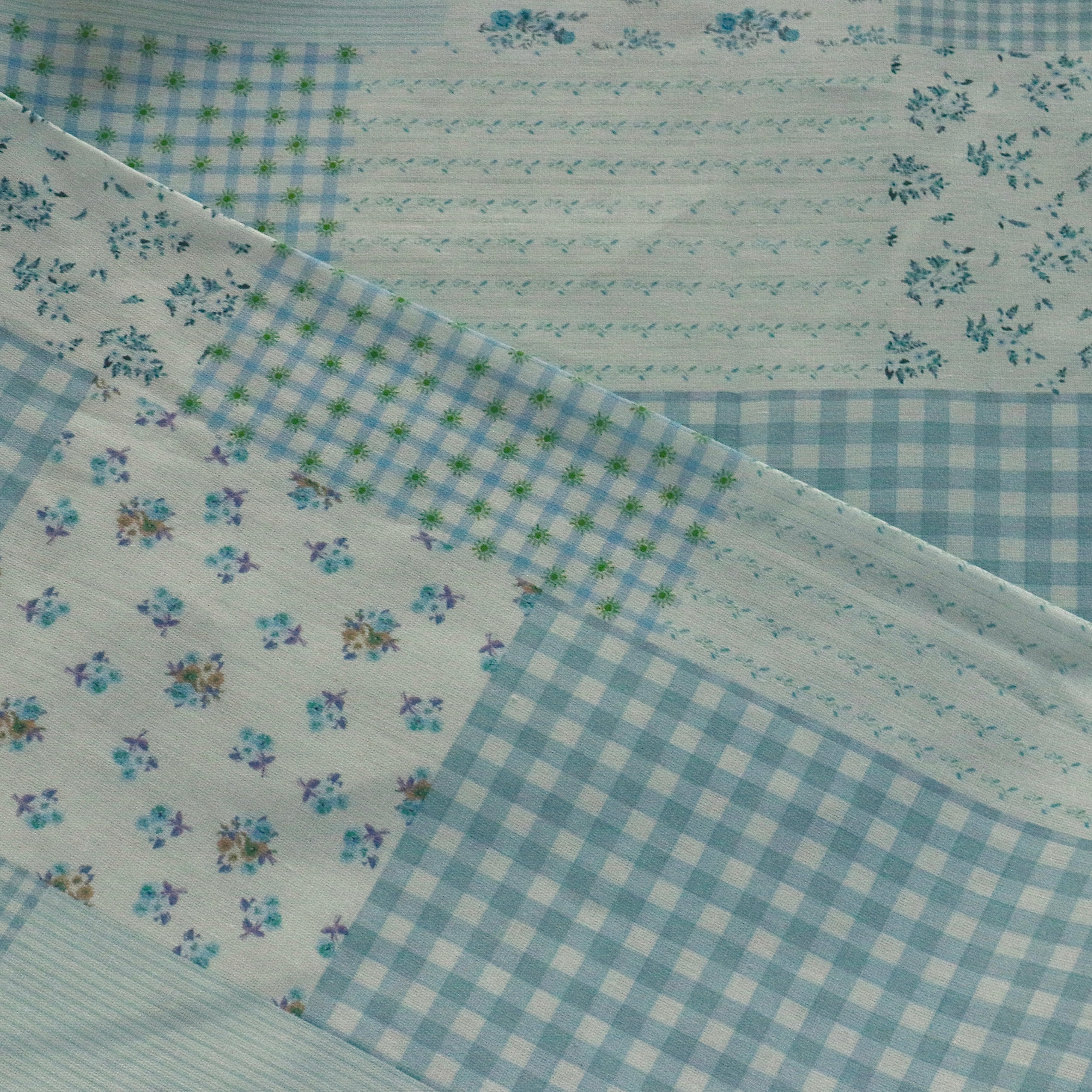 【生地】100%コットン ブルー系パッチワーク風生地 花柄×チェック×ストライプ(幅145cm・長さ50cm単位)
