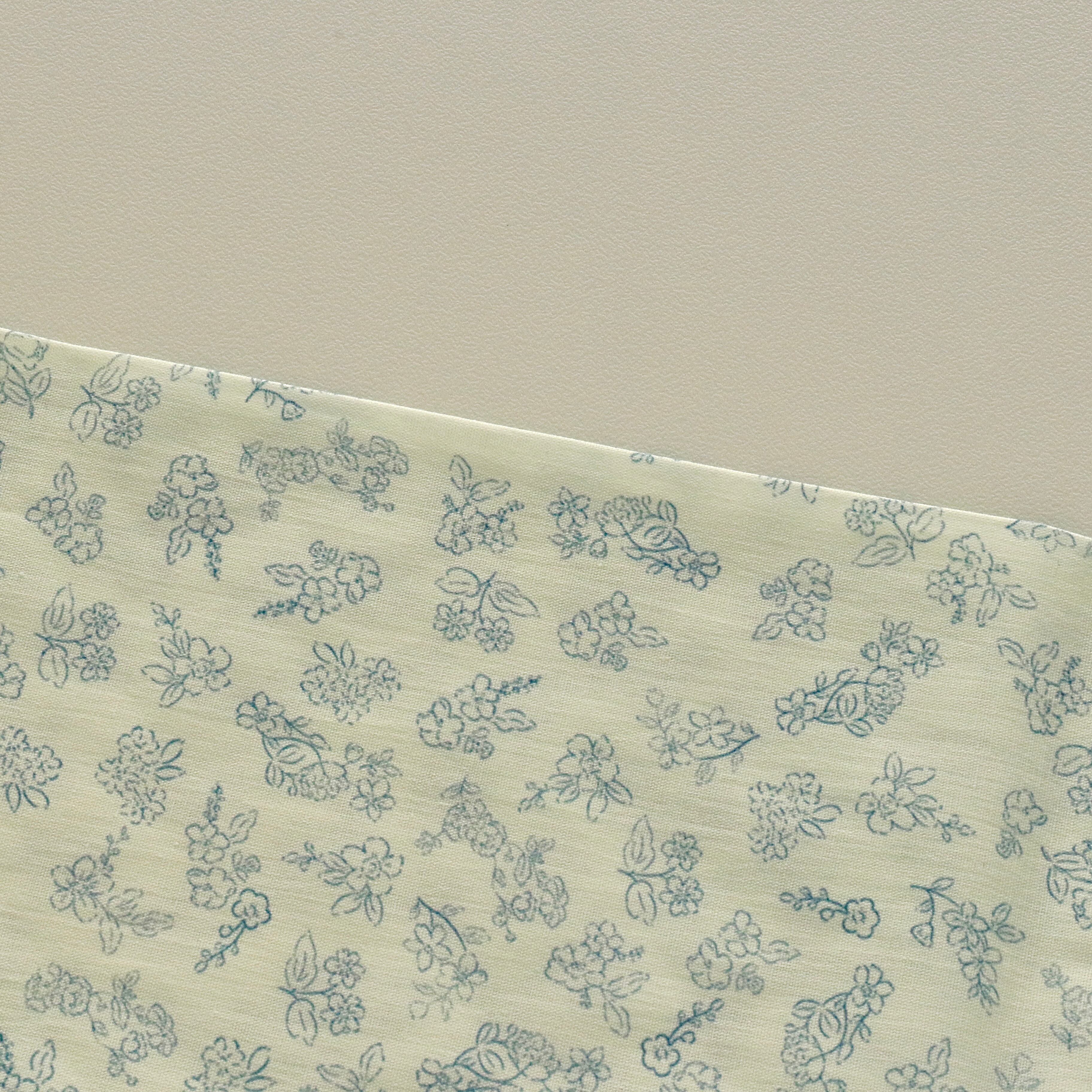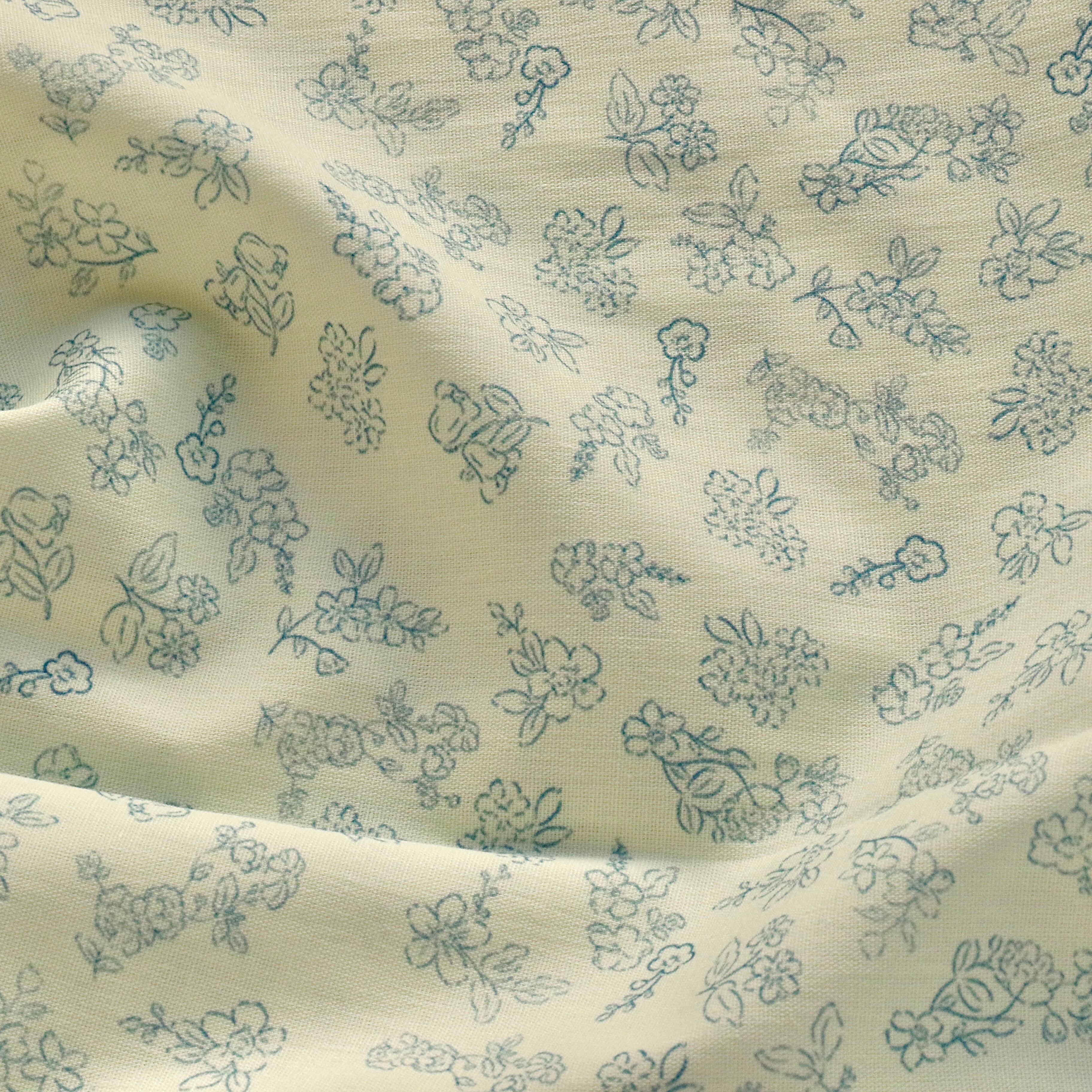 淡いアイボリー地に、ブルーグレーの小花模様がふんわりと描かれた、上品でナチュラルなコットン生地です。どこかアンティークな趣も感じられる、控えめで美しいデザイン。