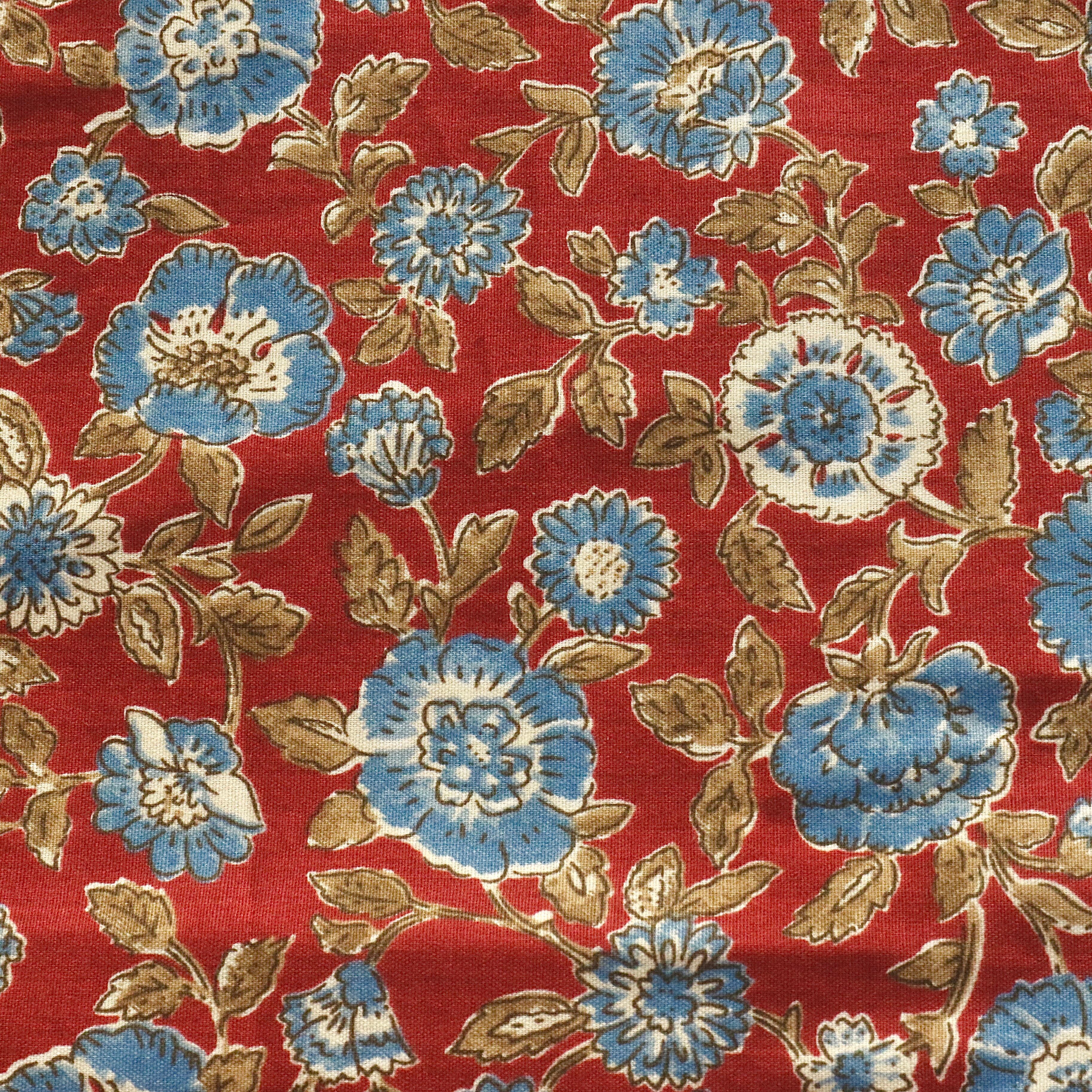 温かみのある赤茶色の地に、優しいブルーと生成りの花々が咲き誇る、クラシカルなフラワープリント生地です。落ち着いた色味の中にも、可憐な華やかさが漂い、どこか懐かしさを感じさせる一枚。