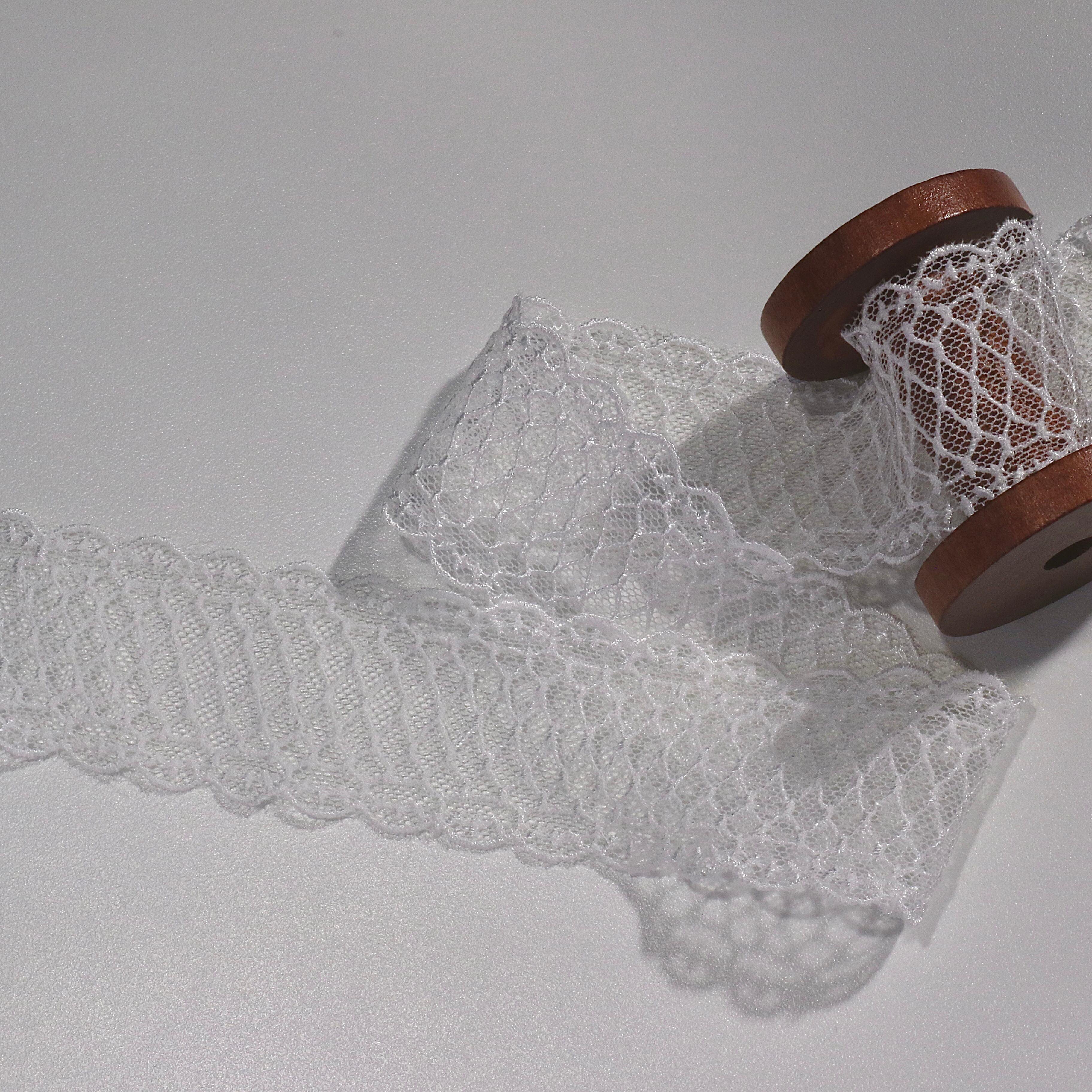繊細なメッシュデザインと波打つスカラップが美しい、ケミカル風のホワイトチュールレースです。