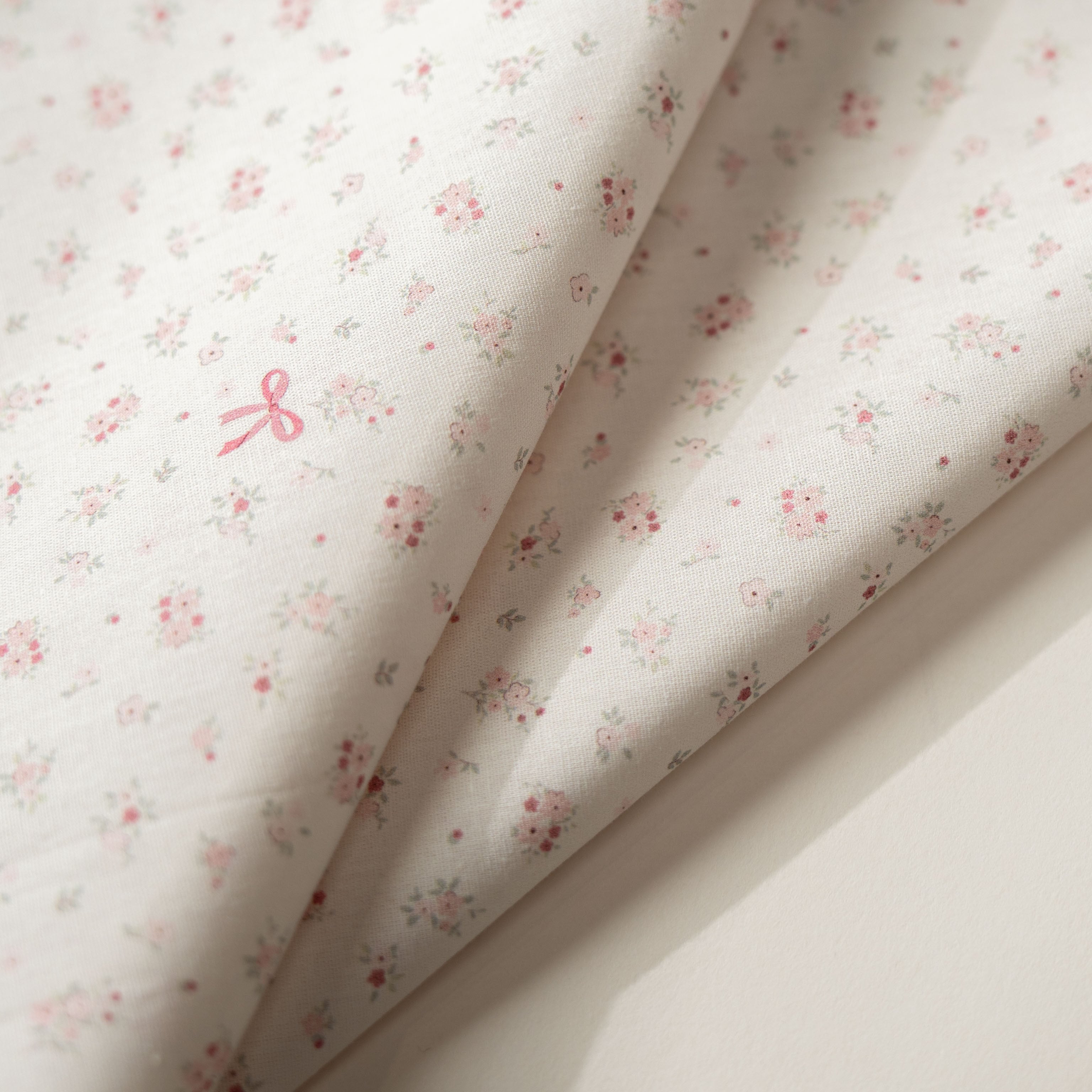 くすみピンクの小花とリボンが愛らしい、ガーリーな小花柄生地です。
