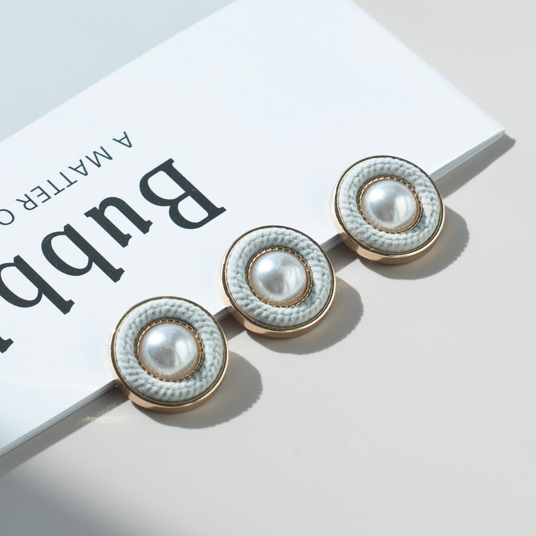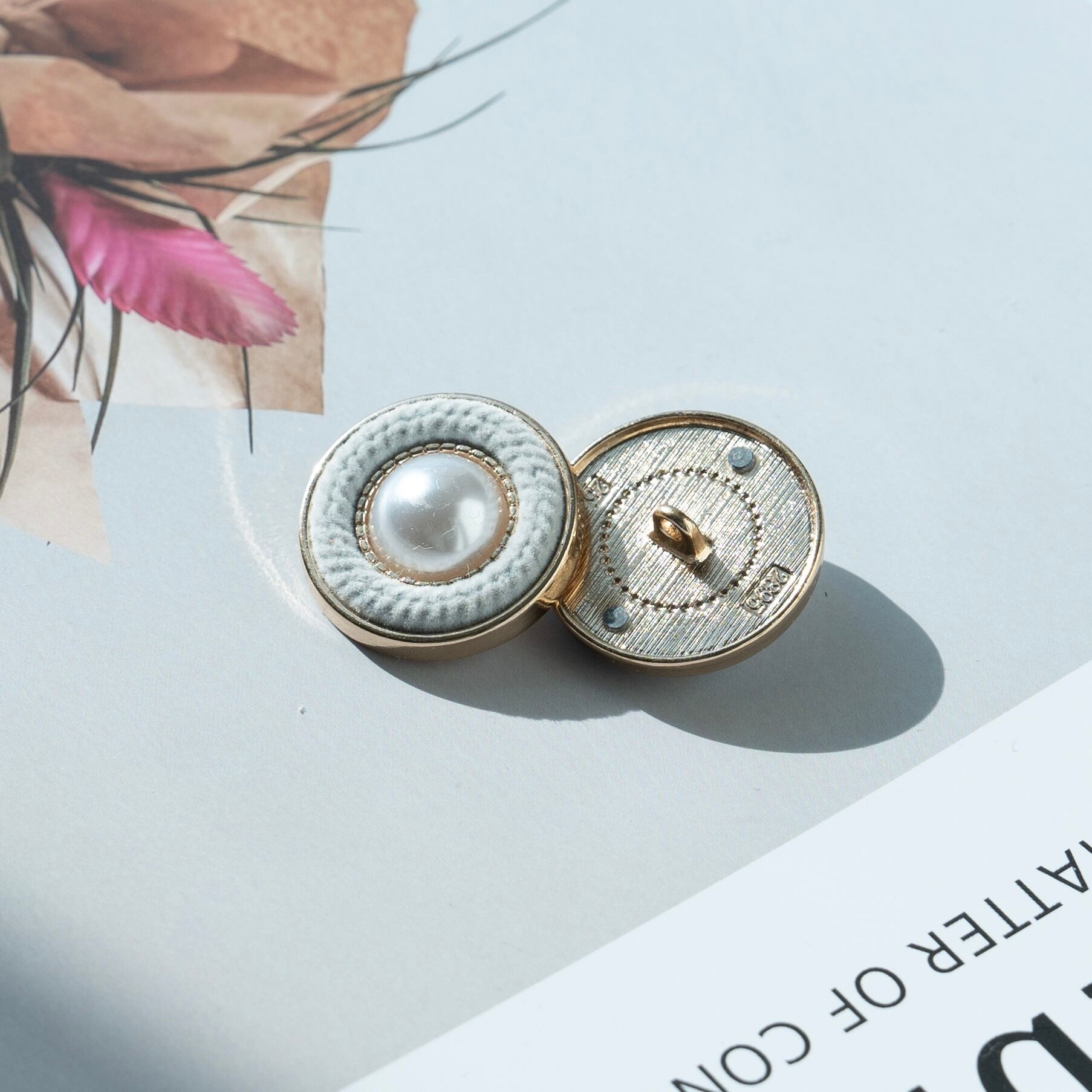 パールの輝きと柔らかな編み風デザインが可愛い、女性らしい雰囲気のボタンです。