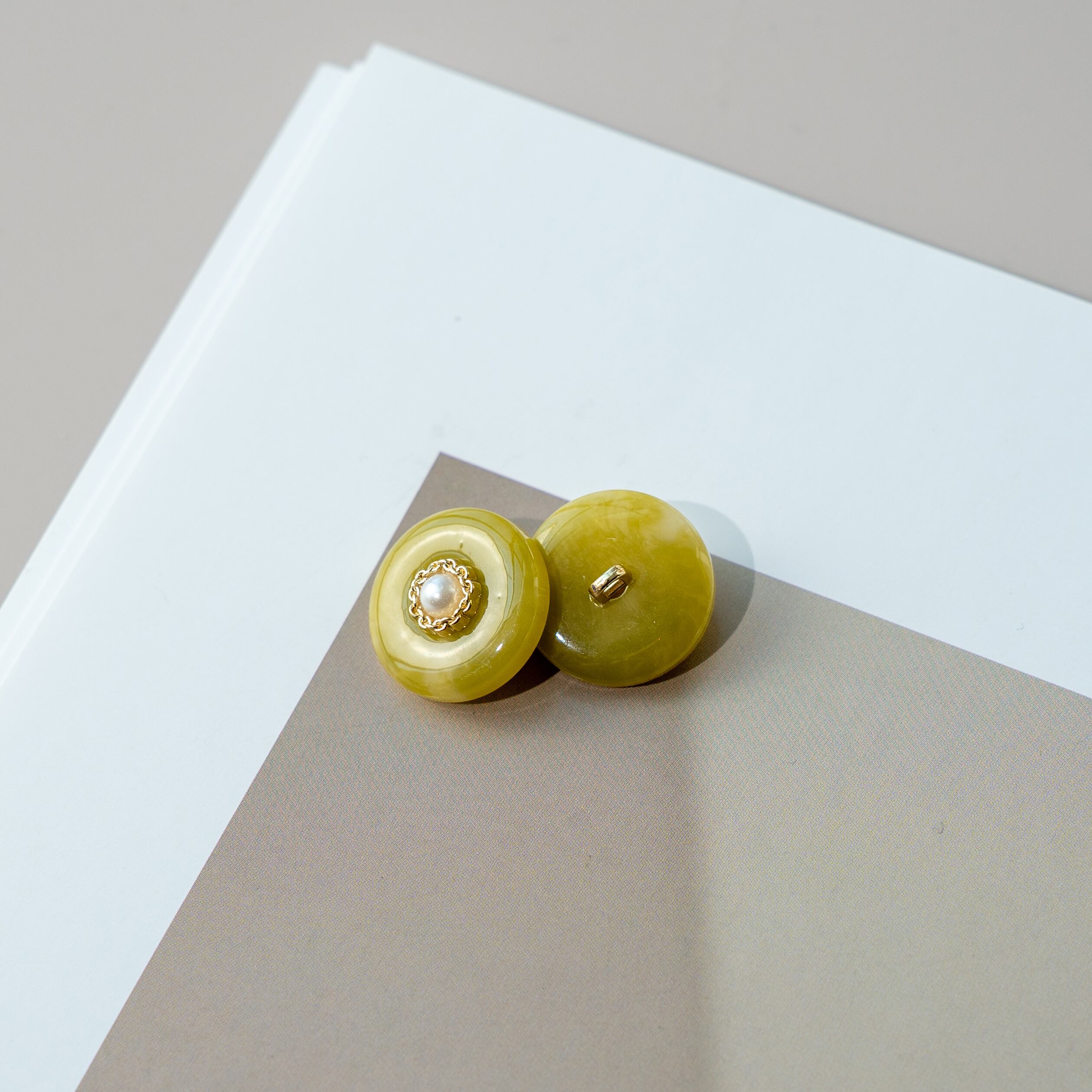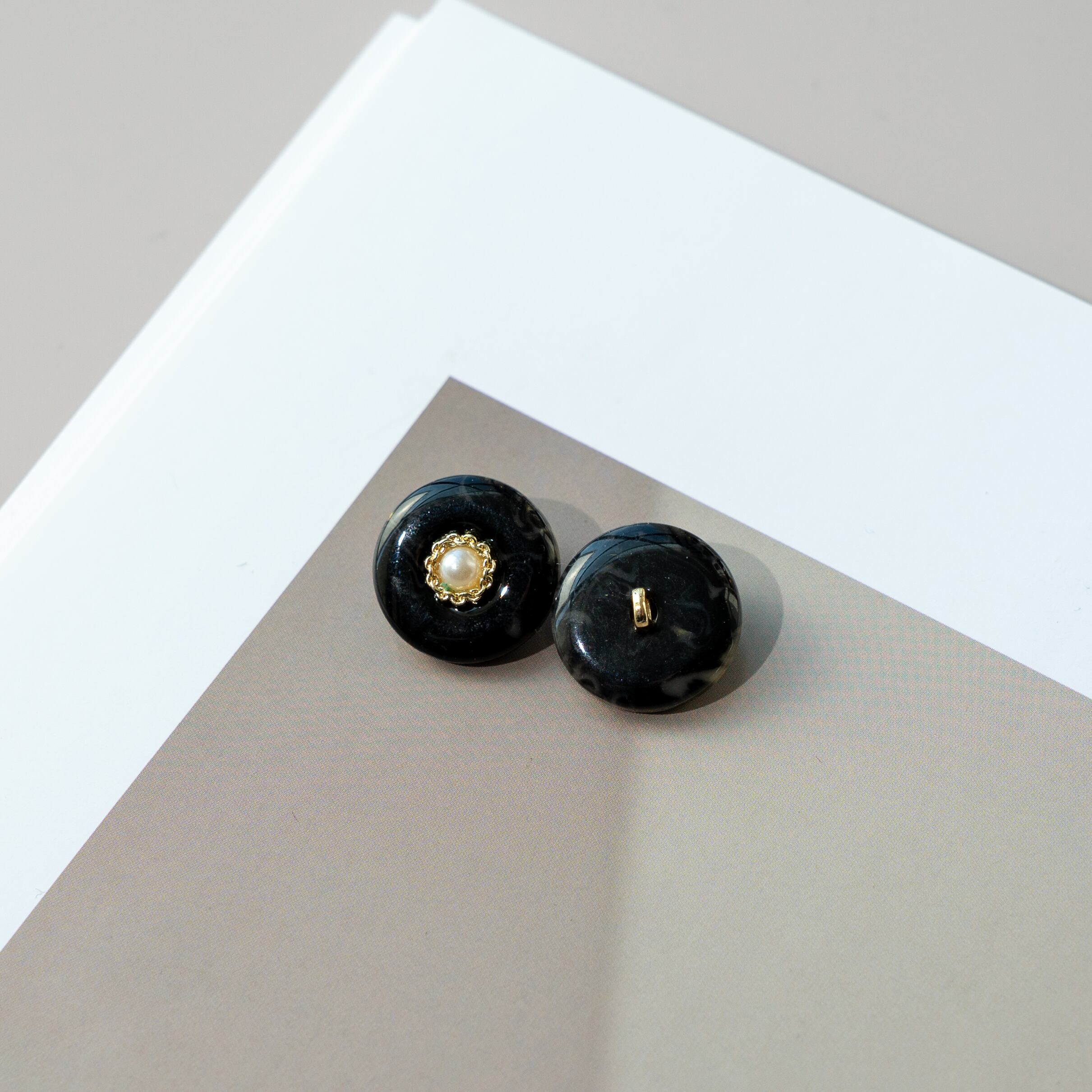 滑らかな光沢をもつ樹脂素材に、中央でさりげなく輝くゴールドパーツを組み合わせた、上品な表情のボタンです。