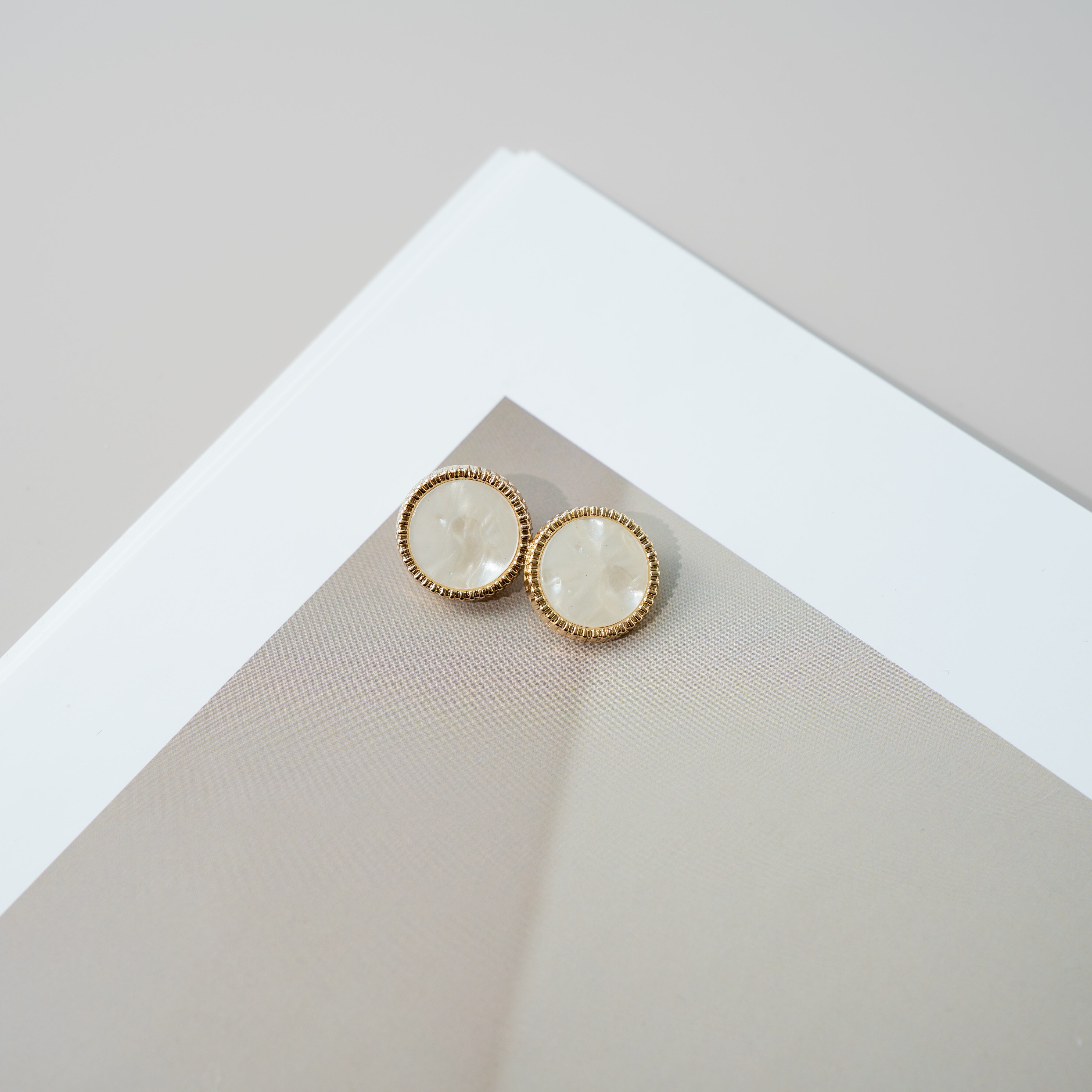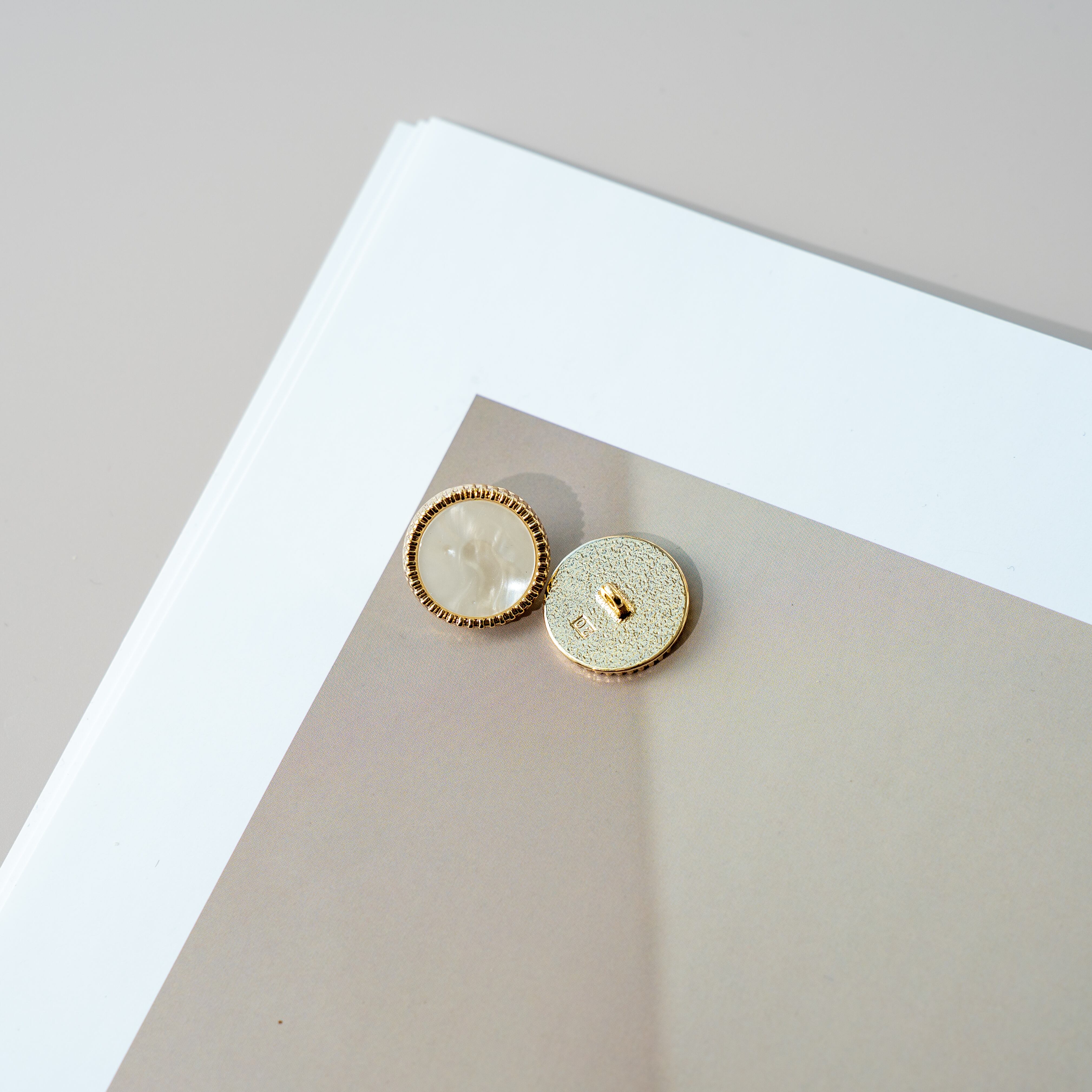 柔らかな乳白色のシェル調素材に、繊細なゴールドフレームを合わせた上品なボタンです。