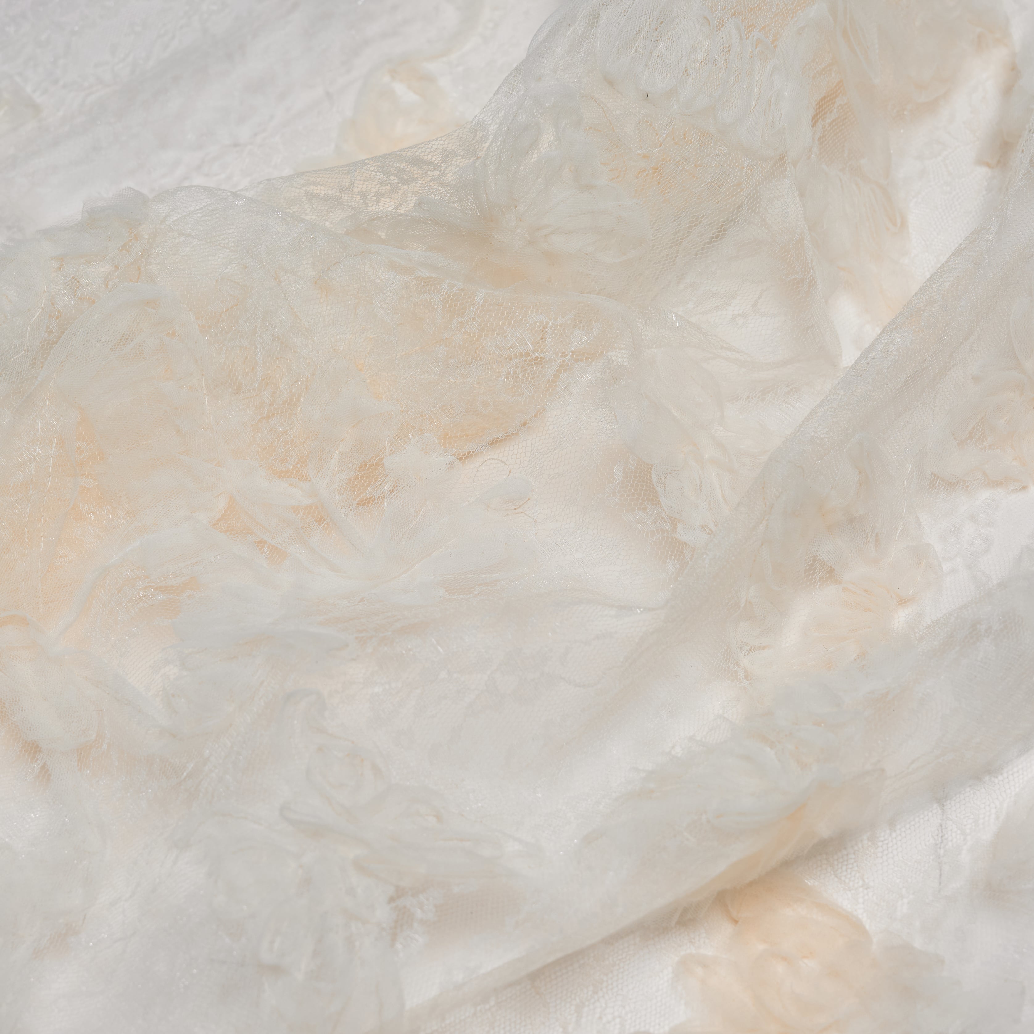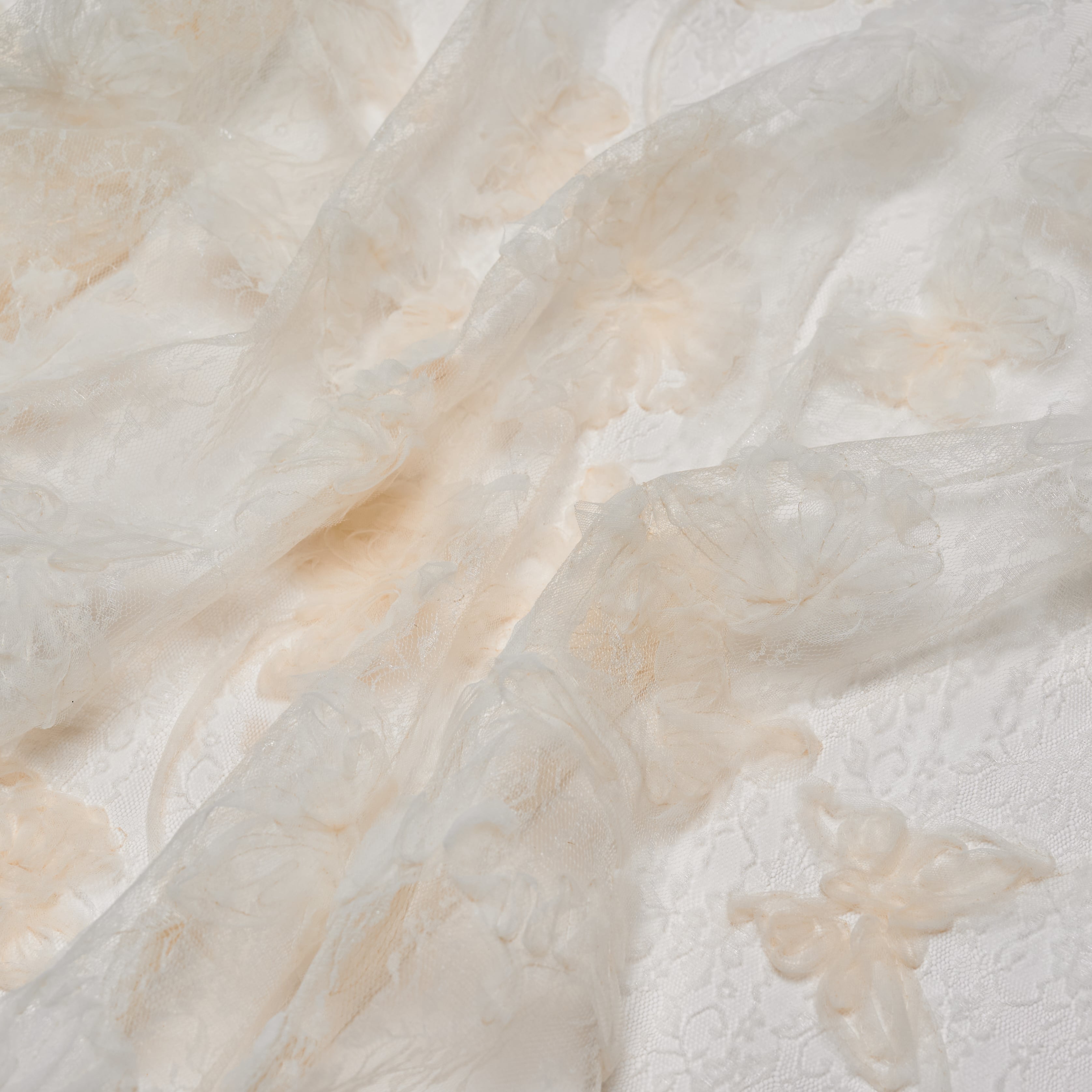 軽やかなチュールに、ふんわり浮かび上がるような蝶々柄がデザインされた華やかな生地です。