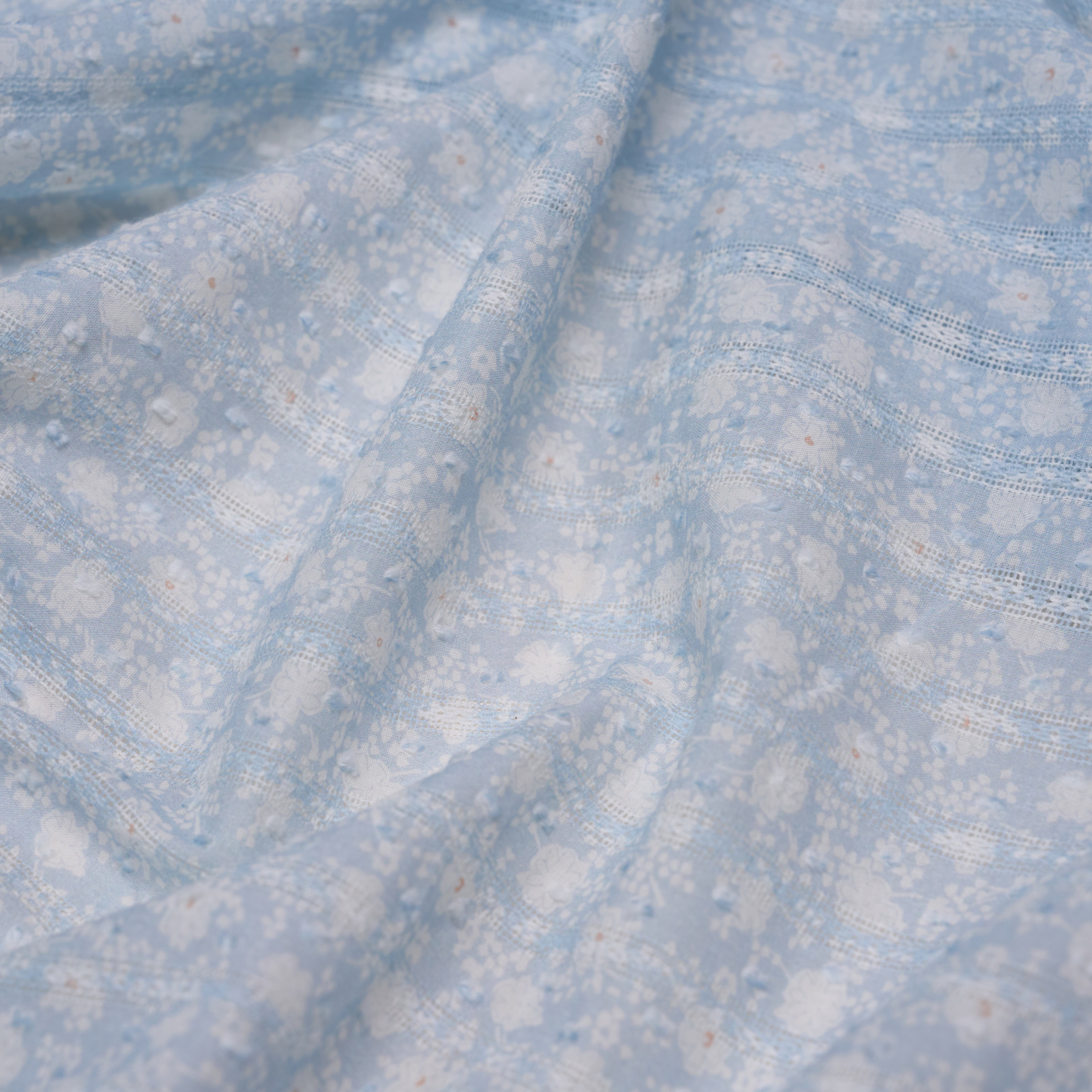 淡いブルーをベースに、小さな花柄とストライプを組み合わせた、やさしい表情のコットン生地です。
