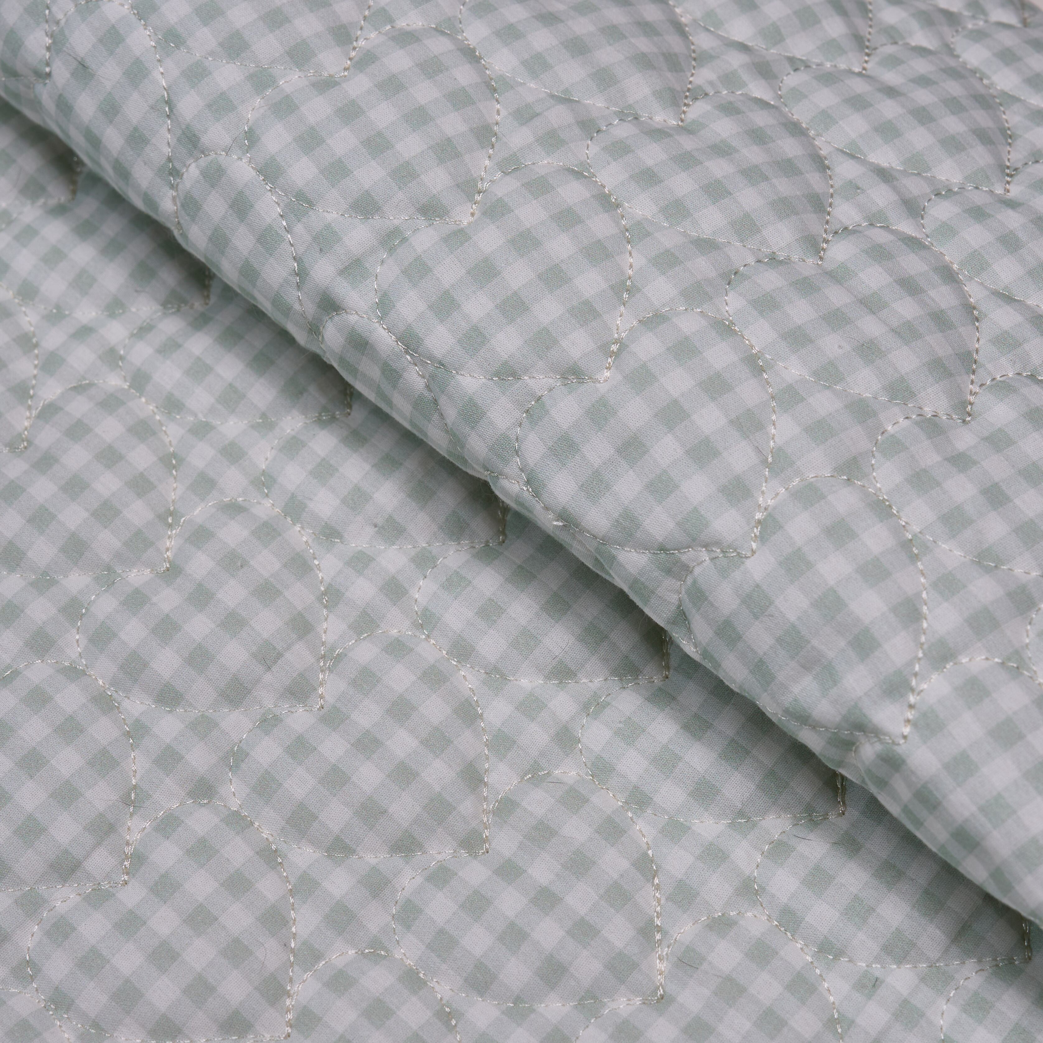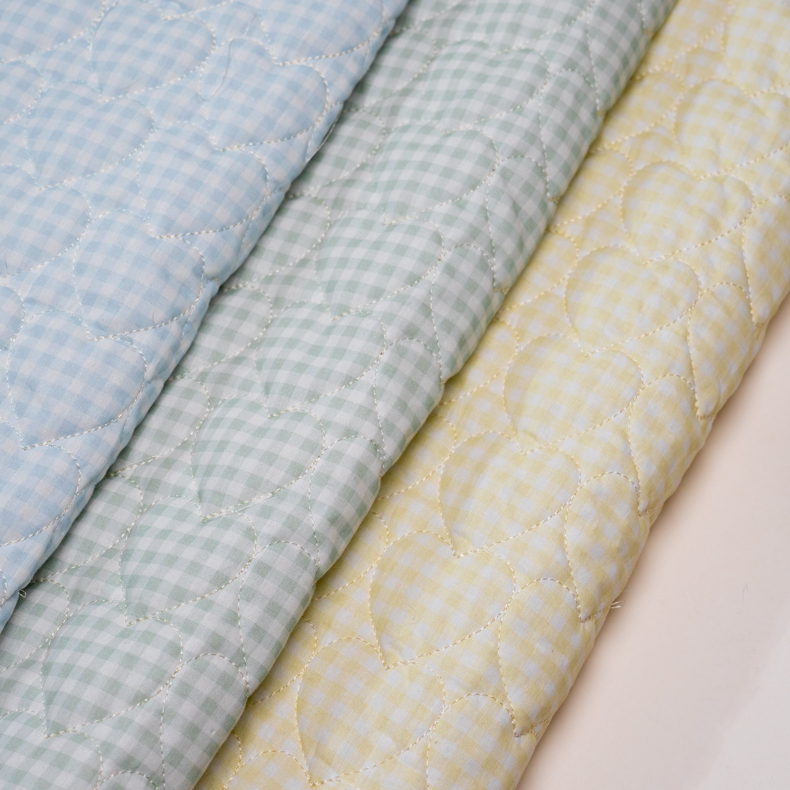 やさしいギンガムチェック柄に、ハート模様のキルティングを施した生地です。