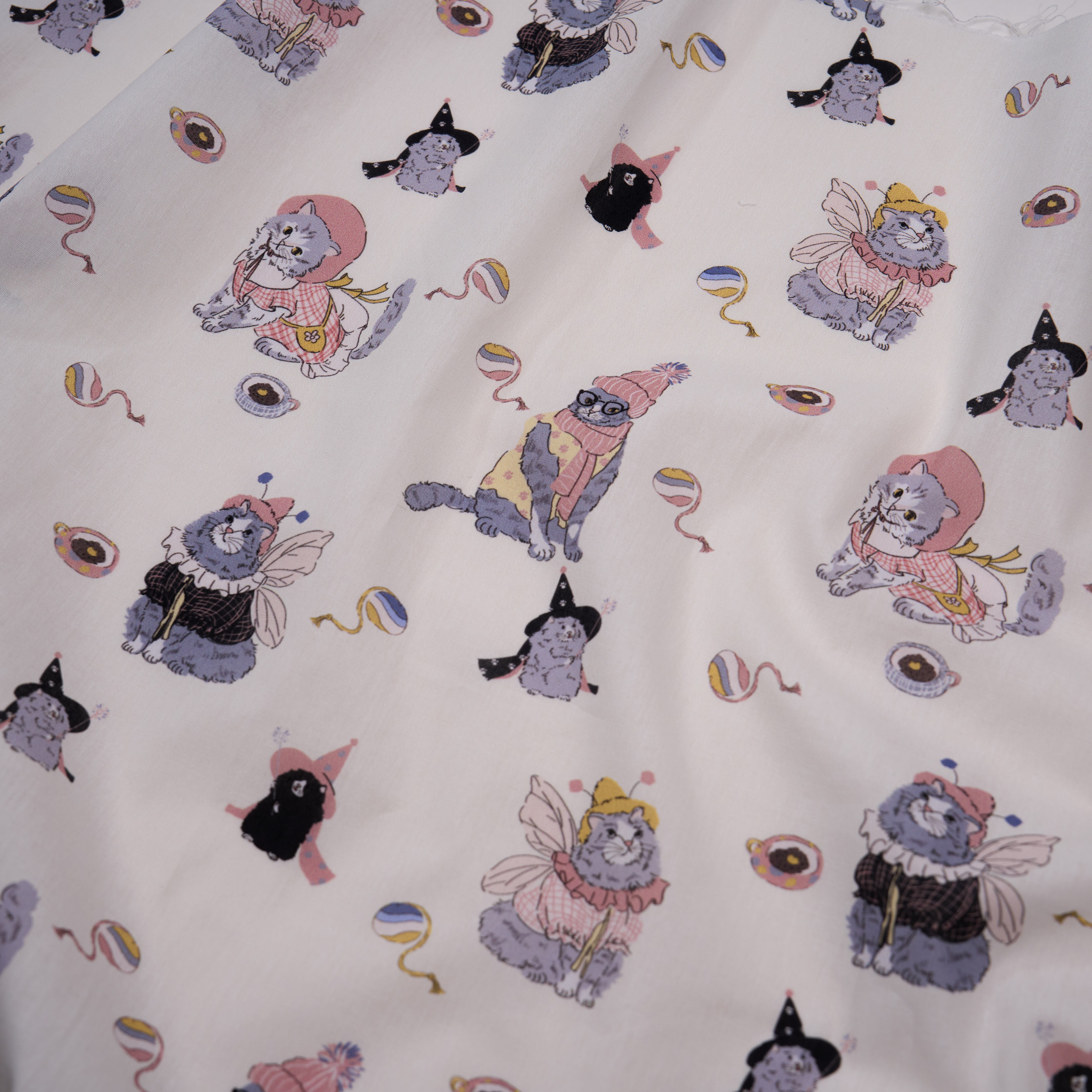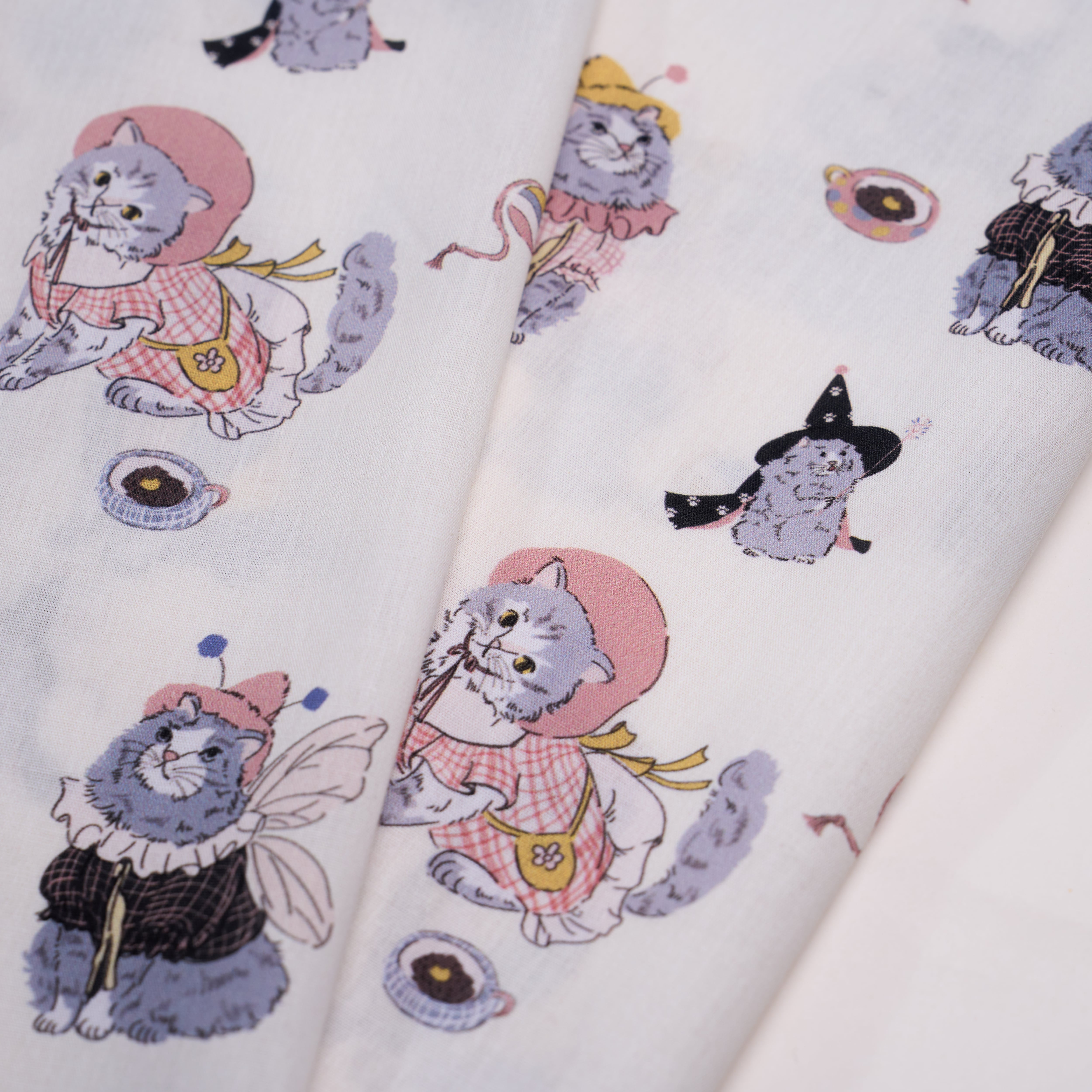 やさしい生成りベースに、帽子やマフラーを身につけたねこたちが描かれた、可愛らしいイラスト柄の100%コットン生地です。淡いパステルカラーでまとめられており、甘すぎずやわらかな印象。子ども服やベビーアイテム、ポーチや巾着などの小物作りにおすすめです。