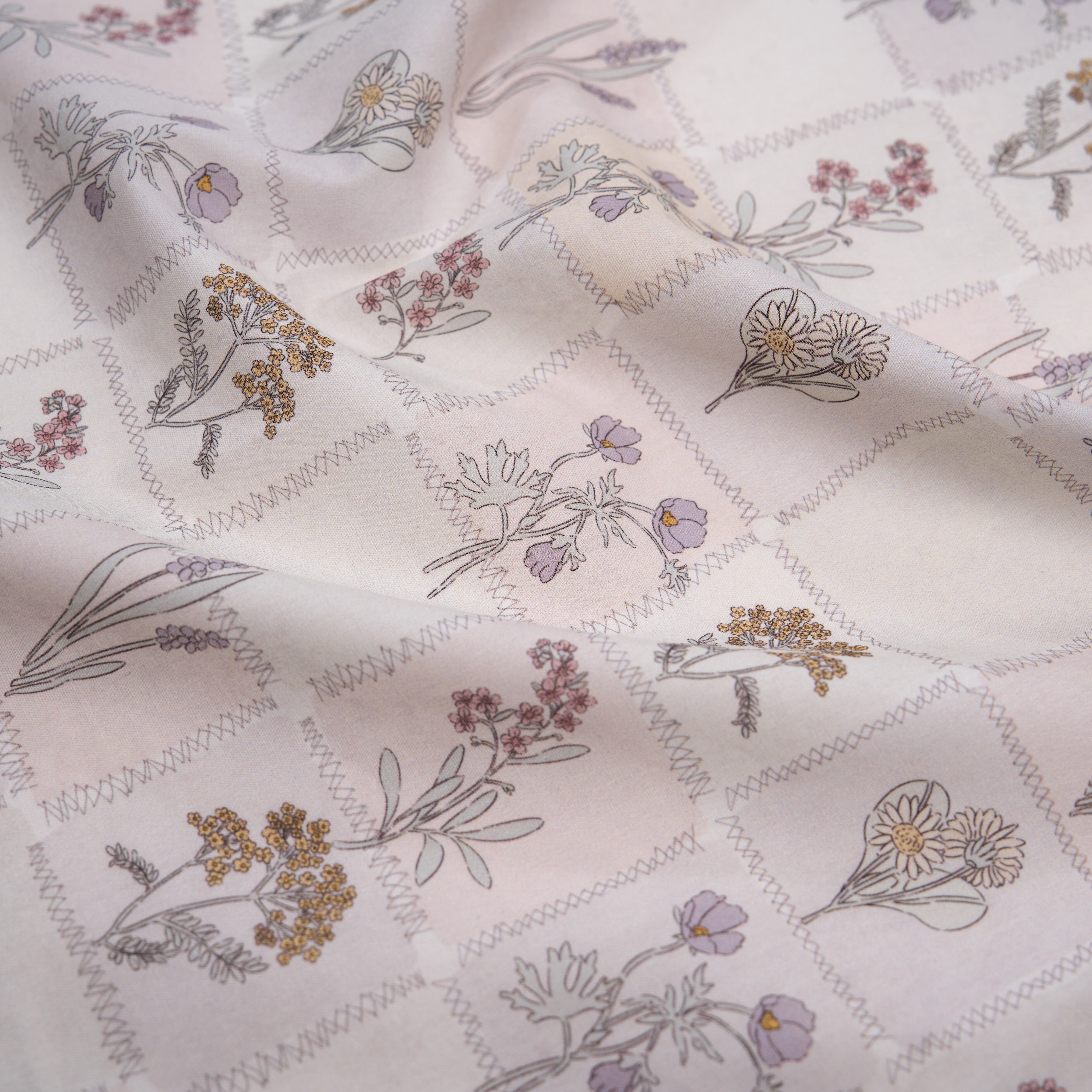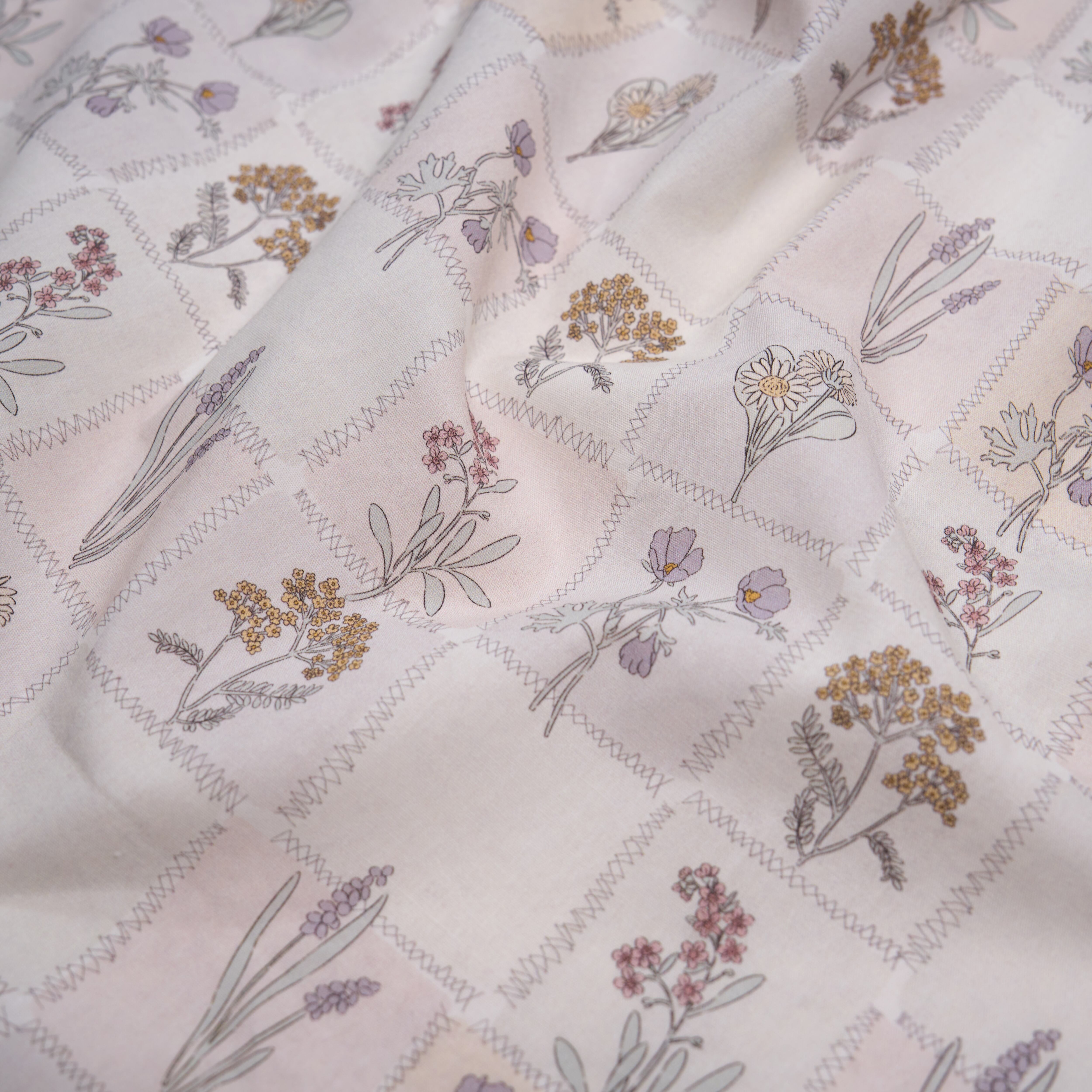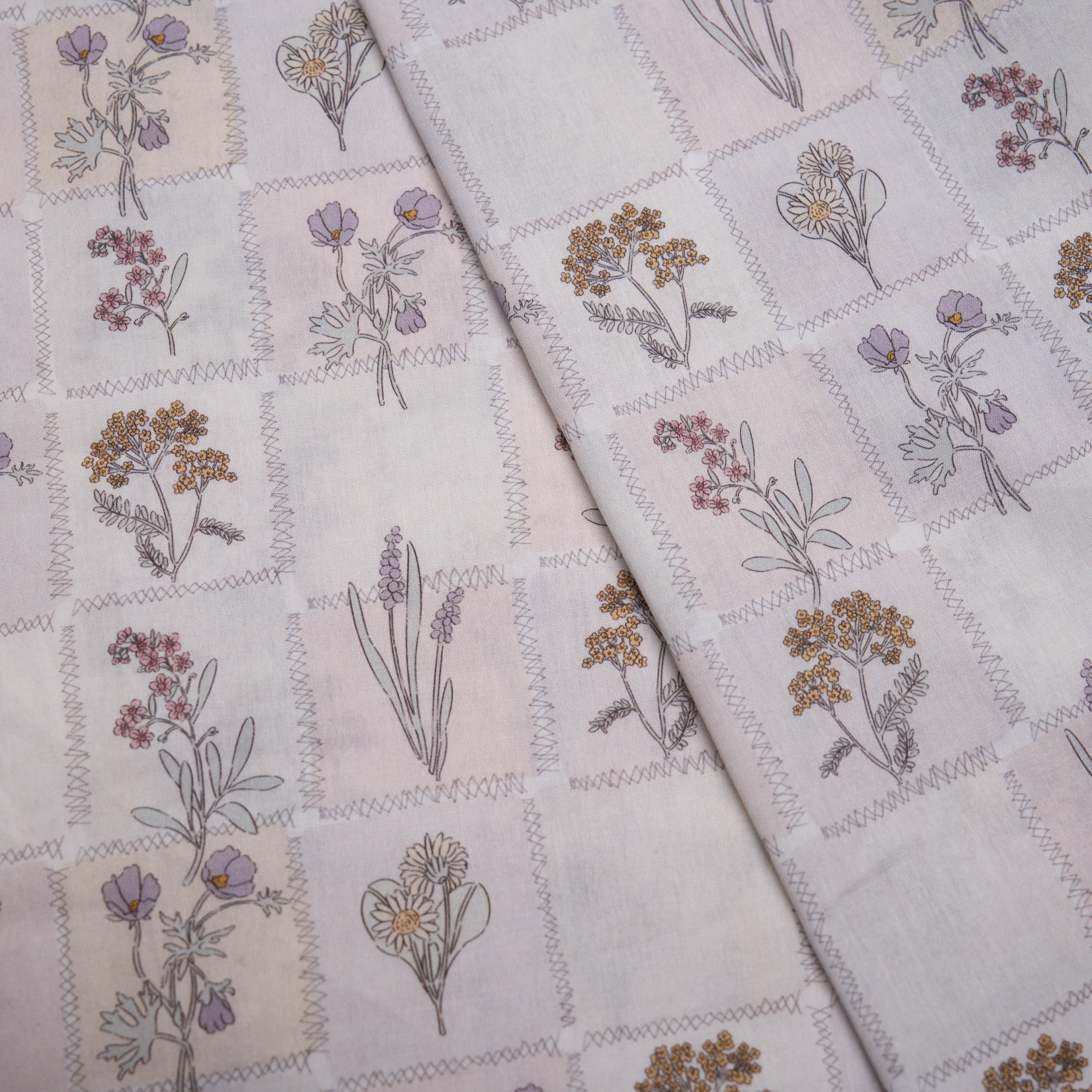 生成りベースに、ラベンダーやくすみ色の草花を描いた、パッチワーク風デザインの生地です。線画調のフローラルモチーフがやさしく並び、落ち着いたナチュラルな雰囲気に仕上がっています。なめらかな触感で、ワンピースやブラウス、小物やインテリア雑貨まで幅広くお使いいただけます。