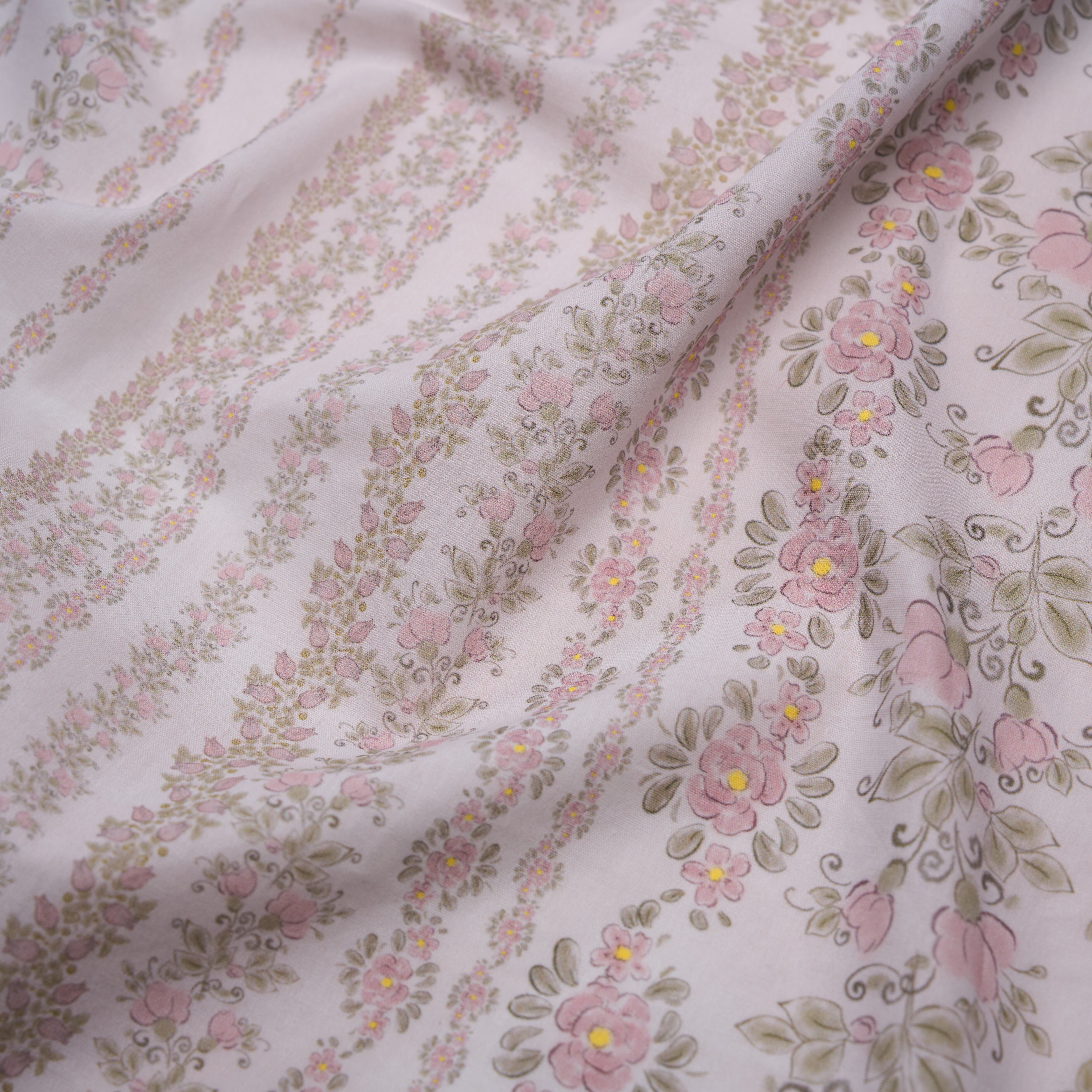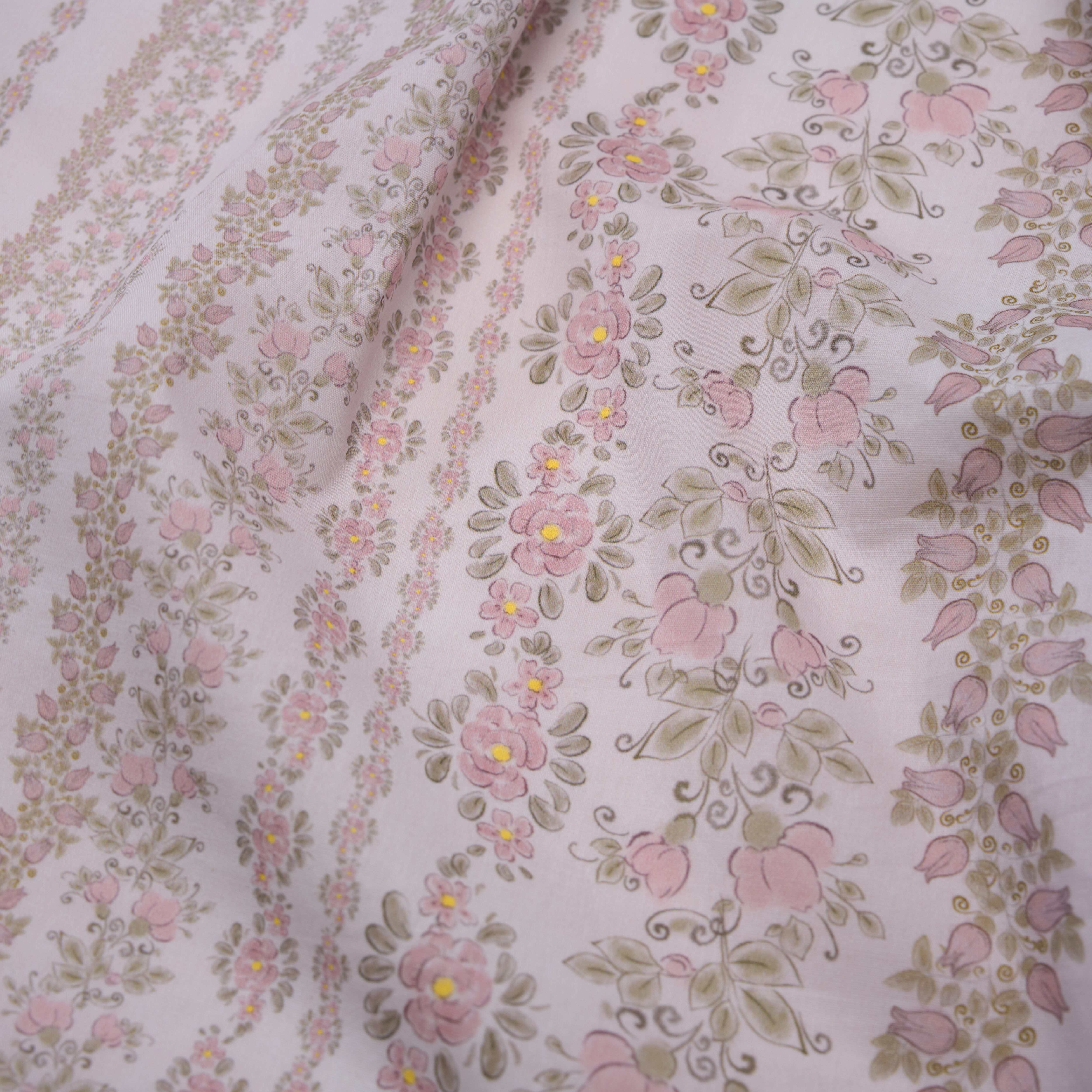 くすみピンクの小花と、セージグリーンの葉模様をストライプ状に配した、やさしく上品な印象の生地です。甘さを抑えた落ち着いた配色で、ナチュラルテイストの作品作りにぴったり。なめらかな触感で、ワンピースやブラウス、ポーチや小物作りにもおすすめです。