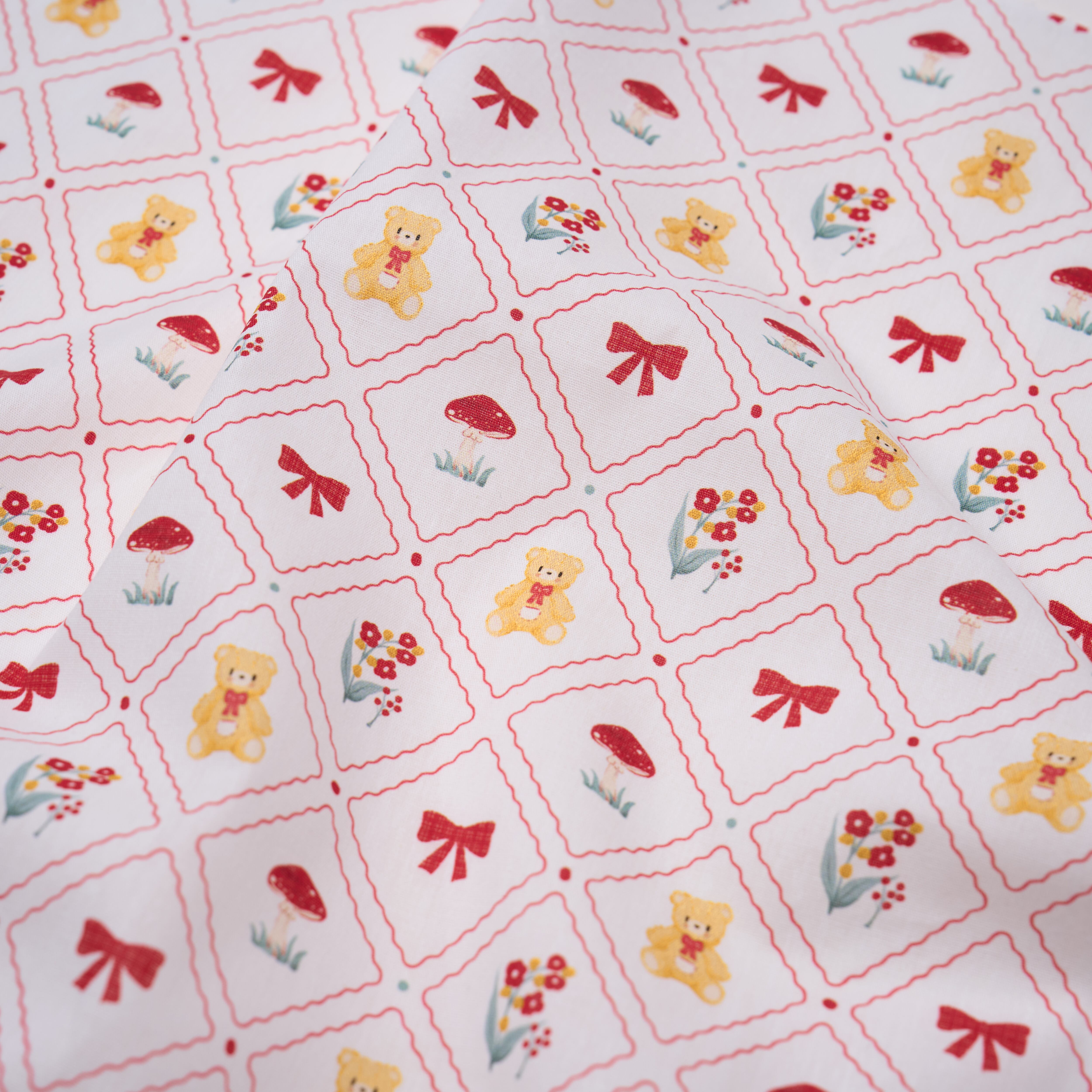 くまやリボン、小花をスクエアフレームに収めた、整った印象のレトロ調コットン生地です。甘さの中に落ち着きがあり、可愛らしさと上品さを兼ね備えたデザイン。お洋服はもちろん、インテリア小物にもおすすめです。