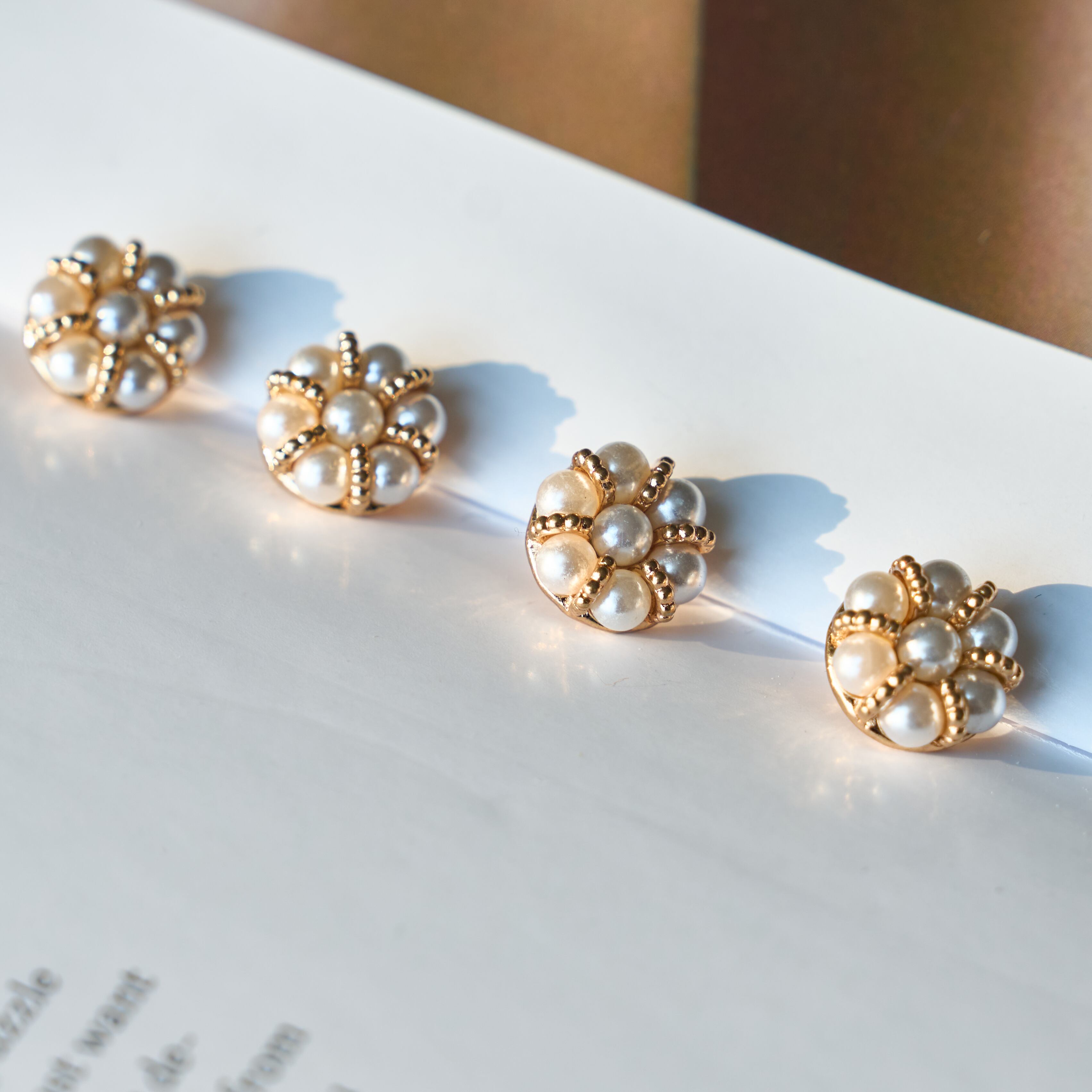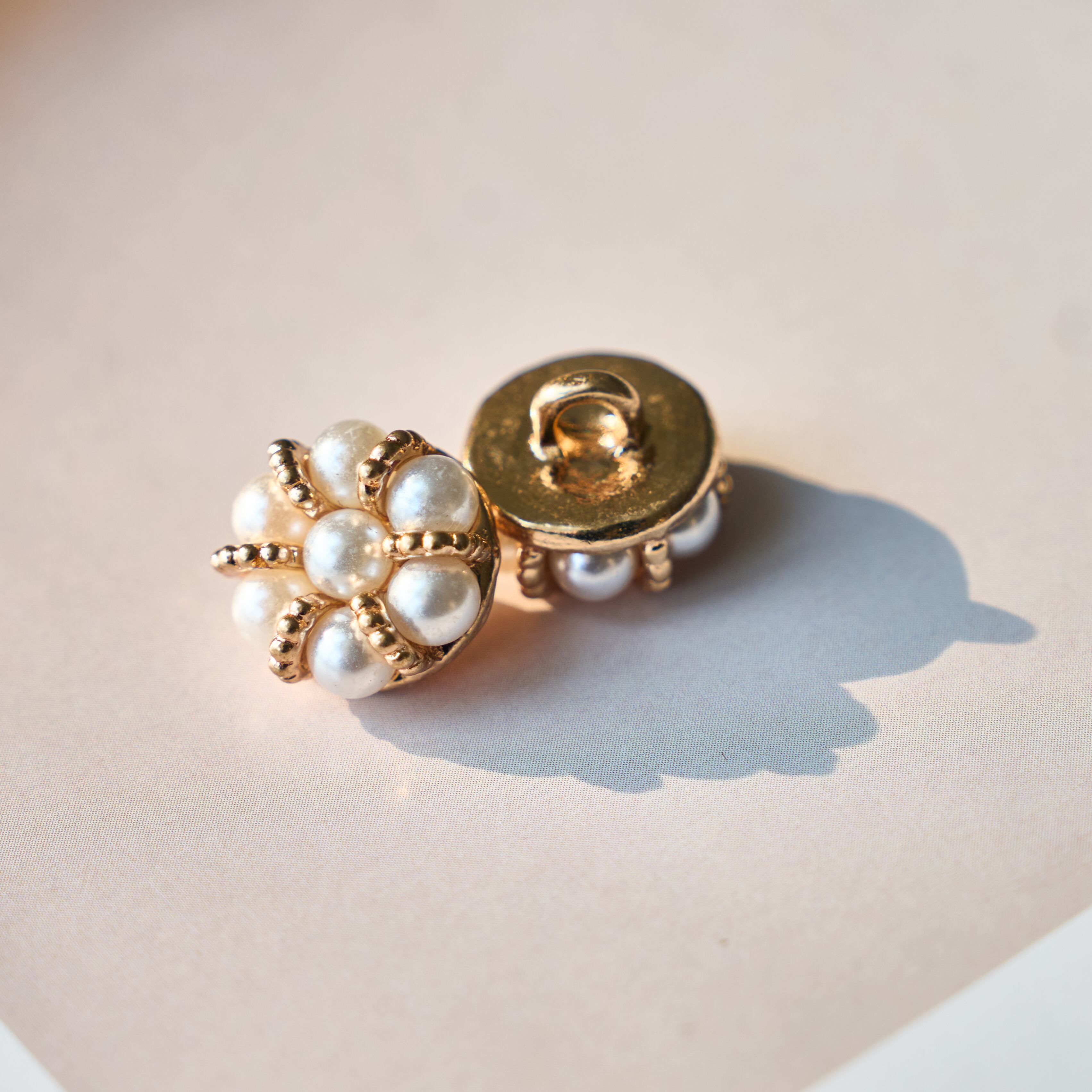 小粒パールを花のようにあしらった、華やかで上品なデザインボタンです。ゴールドの縁取りがやさしく輝き、作品にエレガントな印象をプラス。ジャケットやカーディガン、ワンピースのアクセントにおすすめです。