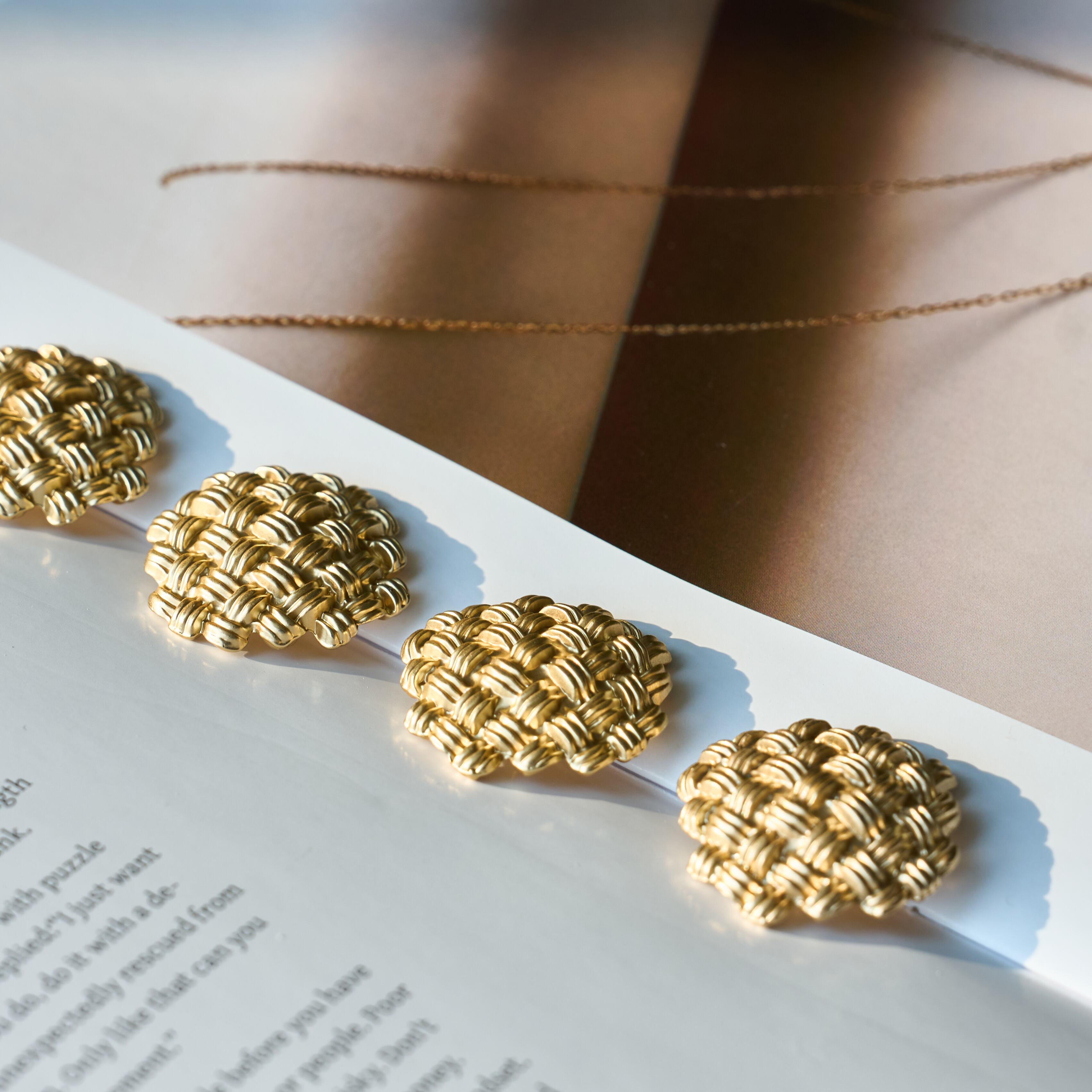 繊細な編み込みのような立体デザインが目を引く、存在感のあるゴールドボタンです。上品な光沢とクラシカルな雰囲気が魅力で、シンプルなアイテムにプラスするだけで一気に高見え。ジャケットやコート、ハンドメイド作品のアクセントにおすすめです。